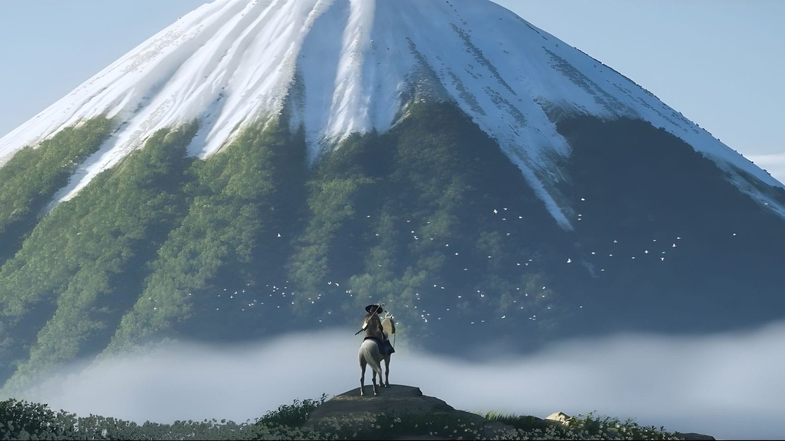 Ezo es uno de los mundos abiertos más hermosos que verás en esta generación. Sucker Punch optó por un enfoque estilizado en vez de hiperrealista: colores sobresaturados, partículas de hojas al viento, composiciones casi pictóricas. La cámara se aleja cuando cabalgas por llanuras para capturar el paisaje completo, y en ocasiones añade bandas negras cinematográficas.